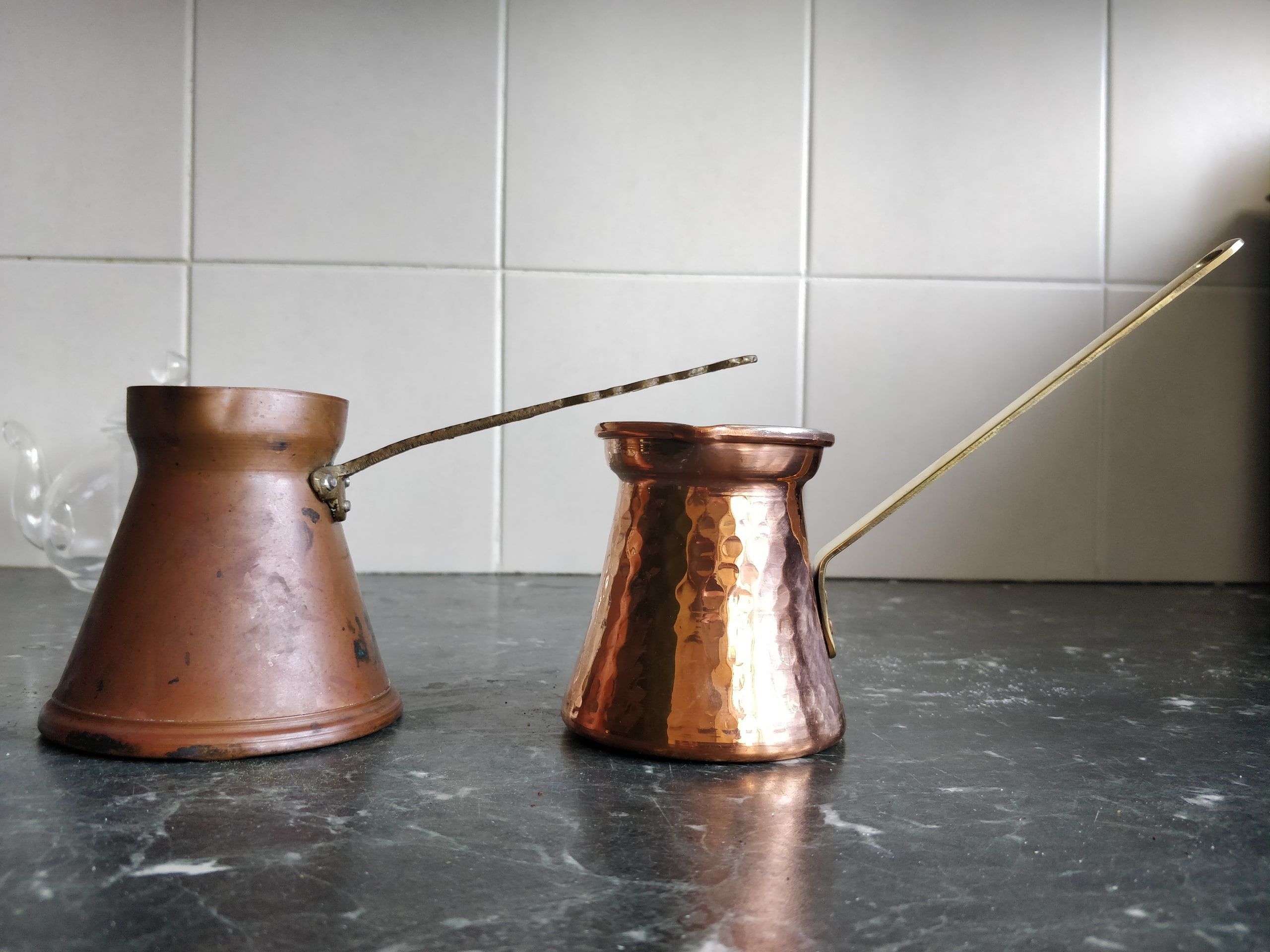 Турку я потом все же нашел на одной барахолке. Старую, тонкостенную, вроде бы польского производства. Еще продается альтернатива в виде китайских металлических турок, но по форме это скорее чашка с ручкой. Никакого сужения горлышка нету. Не знаю, что за металл там используется, но он явно попадает в напиток, а травиться этим не хотелось бы. На фото купленная на барахолке и новая медная турки.