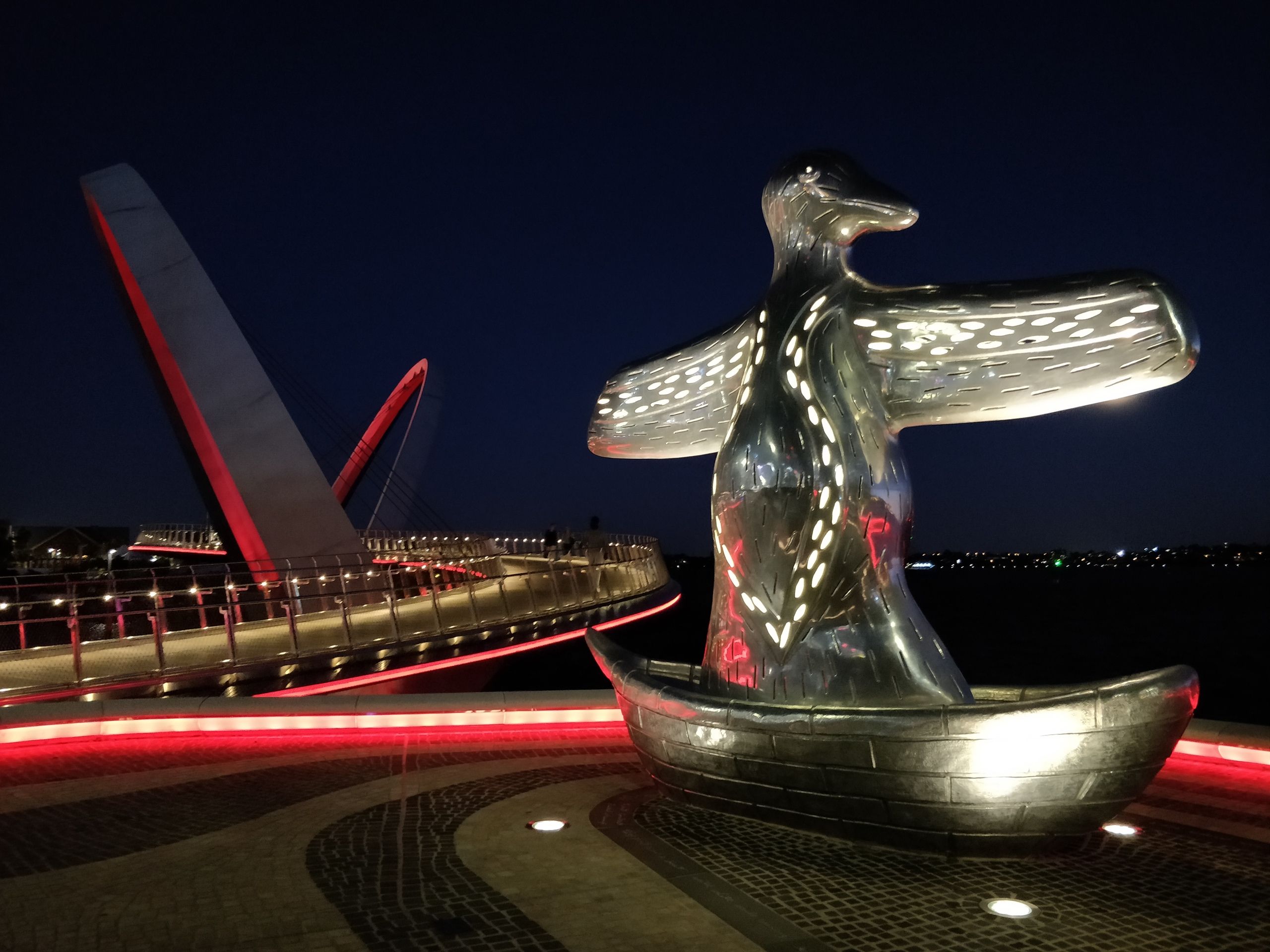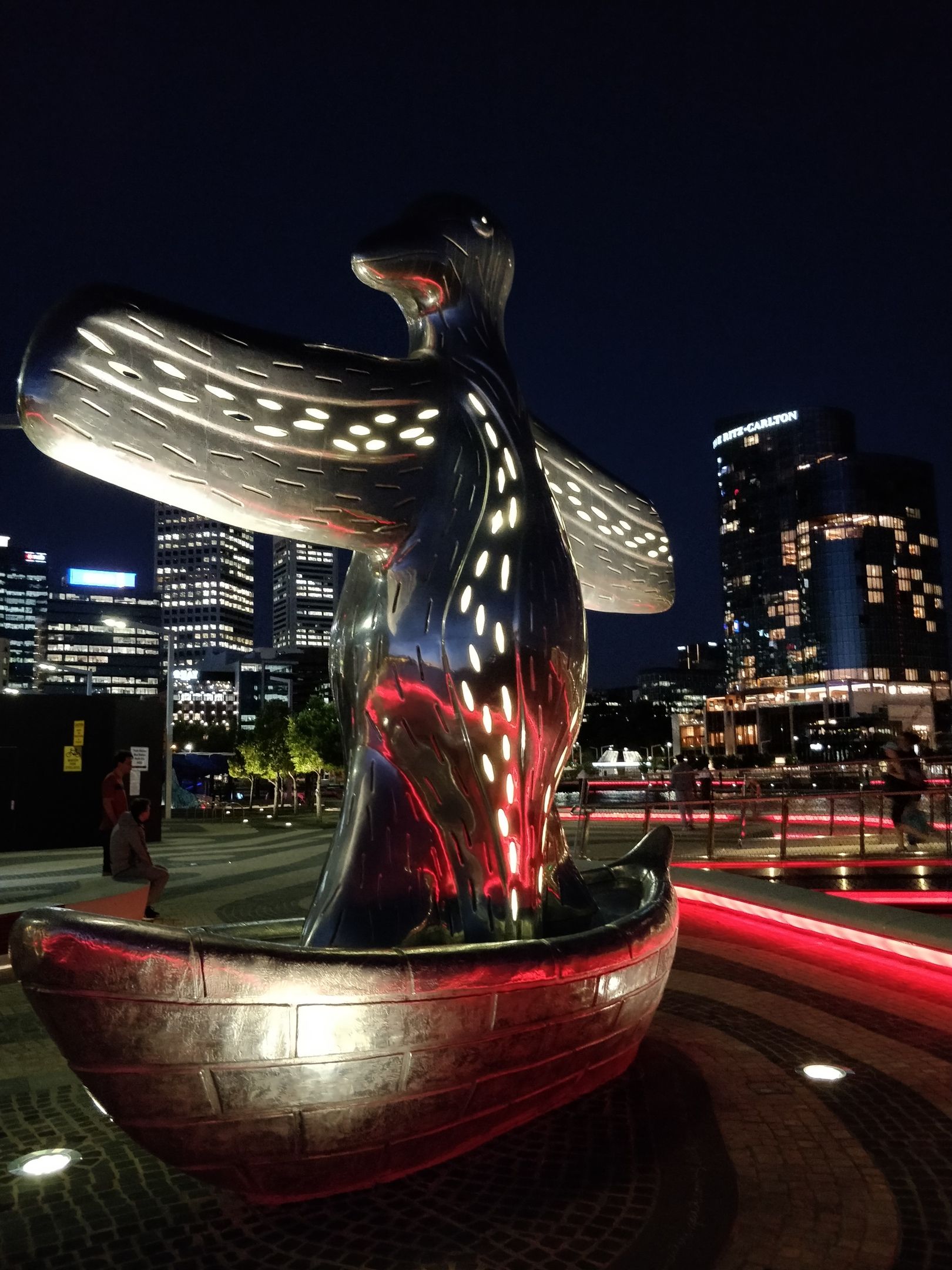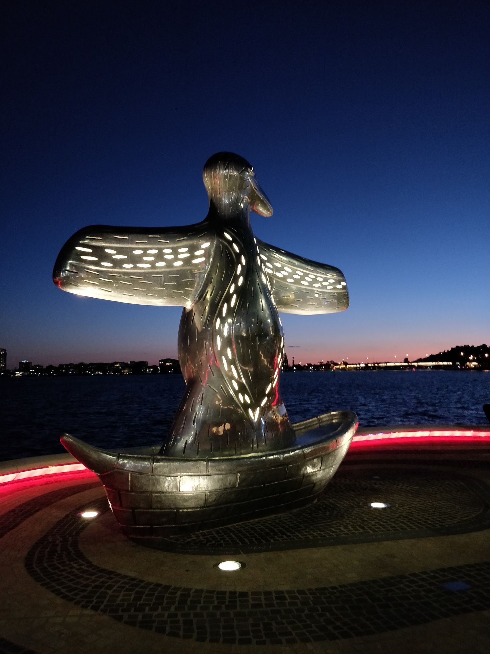 "First Contact is a stunning five metre tall, cast aluminium artwork by renowned indigenous artist, Laurel Nannup. Located at the William Street Landing, the work depicts the arrival of European settlers to Perth. As the European boats arrived, the local Noongar people believed that these ships, were their past ancestors returning from the sea."